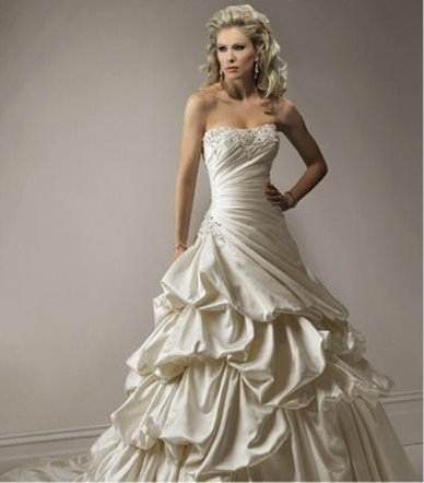 Beaded Strapless Cascading Ruffle Taffeta Floor-Length Sweep Train Wedding Dresses |