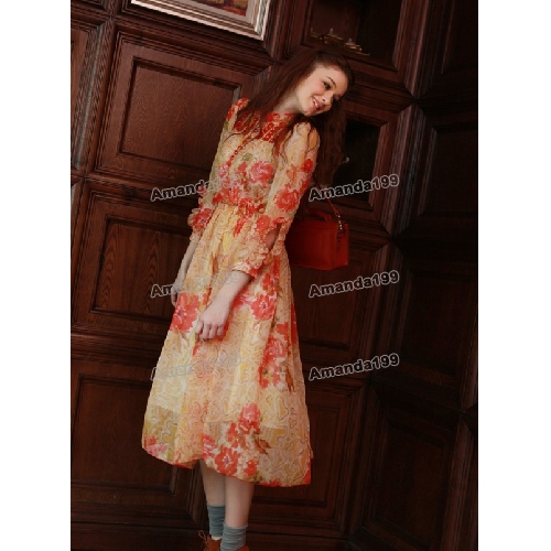 Bohemian Retro Long Sleeve Crystal Buckle Long Style Printing Chiffon Dresses |