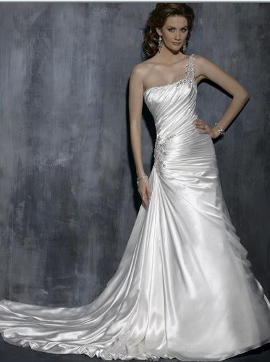 One Shoulder Beaded Side-Draped Floor-Length Court Train Wedding Dresses |