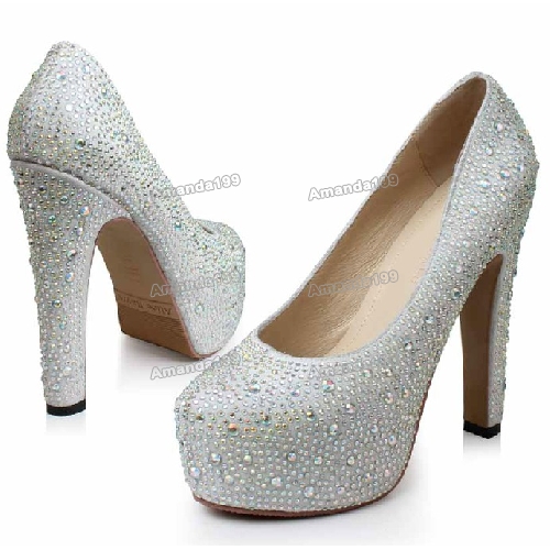 White Diamond Leather Waterproof Crystal High Heels Pumps Bridal Wedding Shoe |
