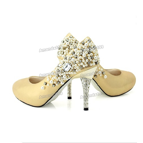 Women's Gold Pearls Diamond High Heel Sheepskin Bridal Shoes |